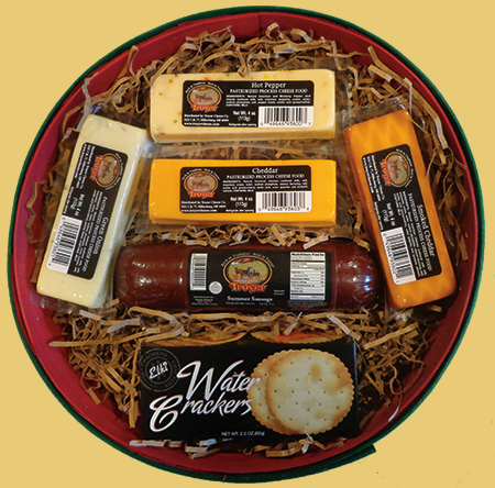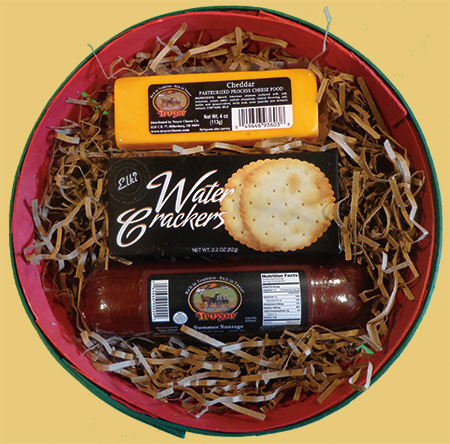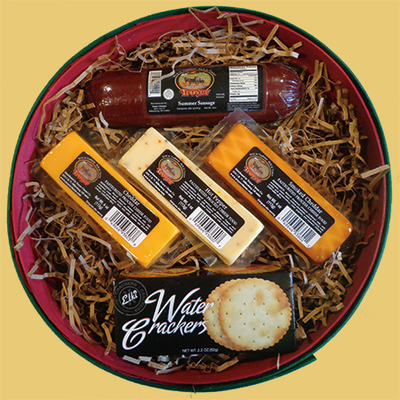 Tired of small meat and cheese baskets.Our sausage and cheese basket has 12oz's of summer sausage, 12oz's of mixed cheeses, and 2.2oz's of water crackers. Great as a gift, or keep all to your self! |